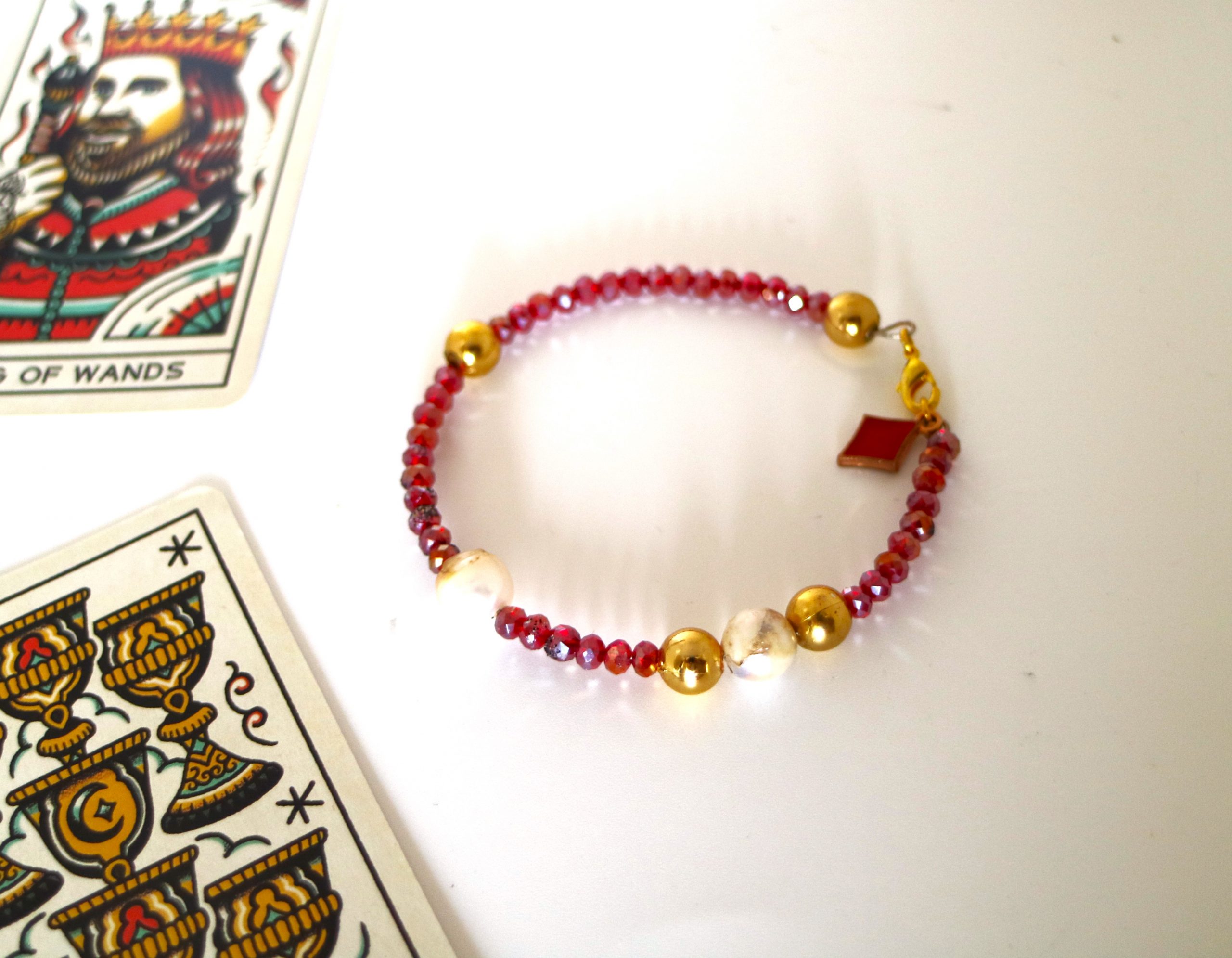 bracciale con perline di giada rossa , vere perle bianche e elementi di contrasto oro .