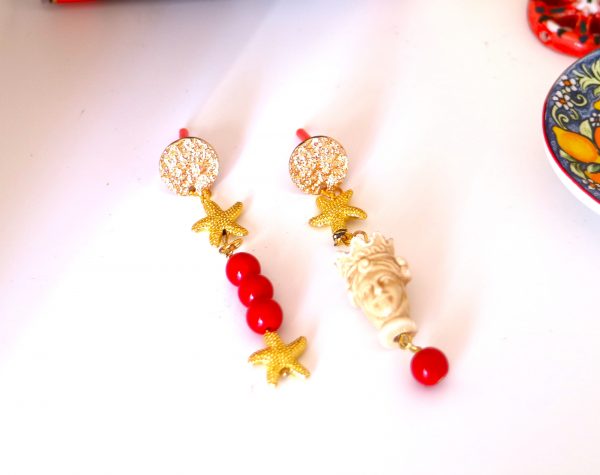 bottone dorato con chiusura a farfalla, stelle marine placcate oro e perle di giada rossa