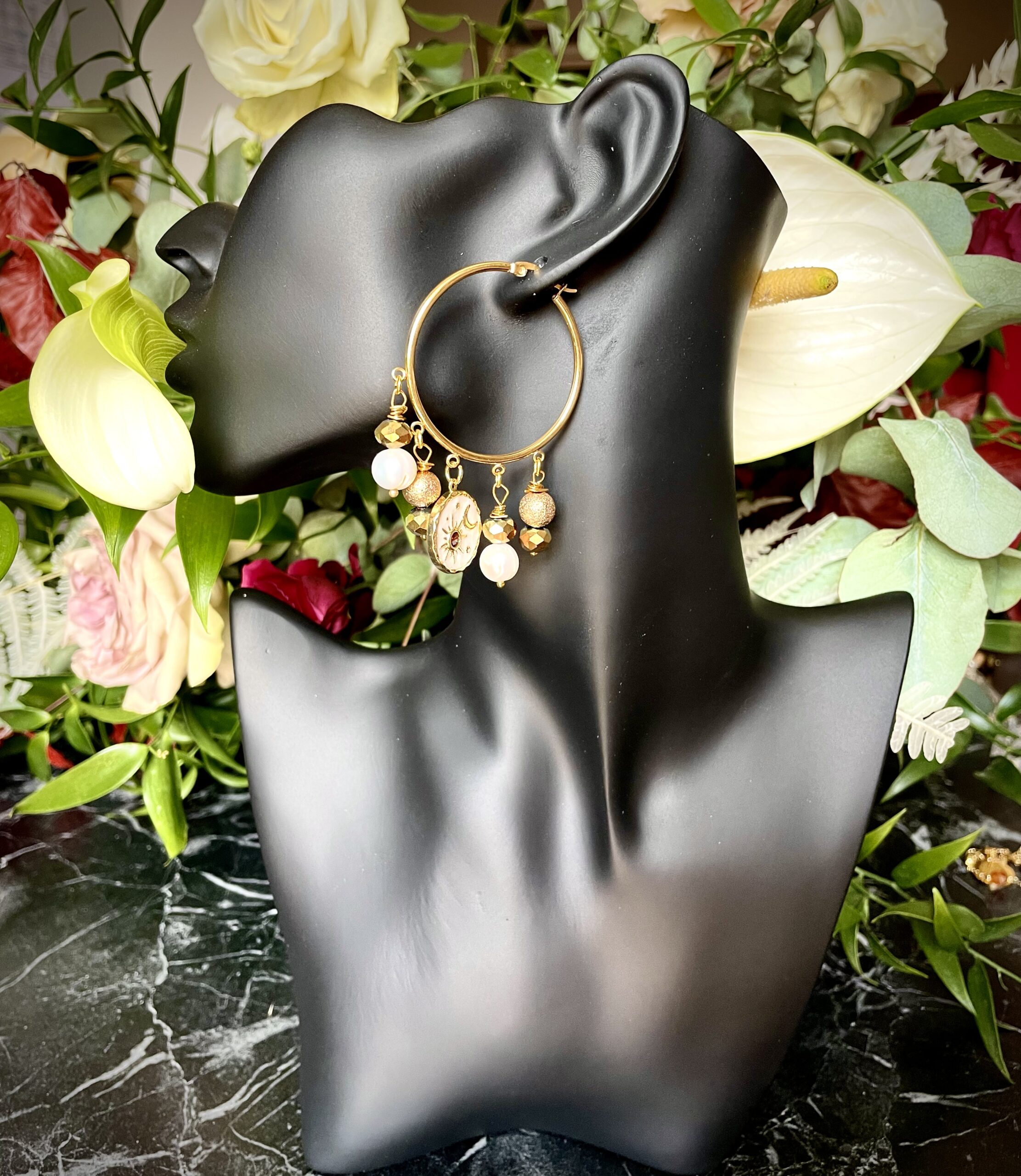 Cerchi di 4 cm di diametro in acciaio inossidabile nikel free accolgono vere perle e elementi dorati che fanno da cornice al primo orecchino che ha un pendente placcato oro 18k con zircone rosso , e al secondo che ha il pendente in acciaio inossidabile placcato oro rappresentante la luna nei tarocchi .